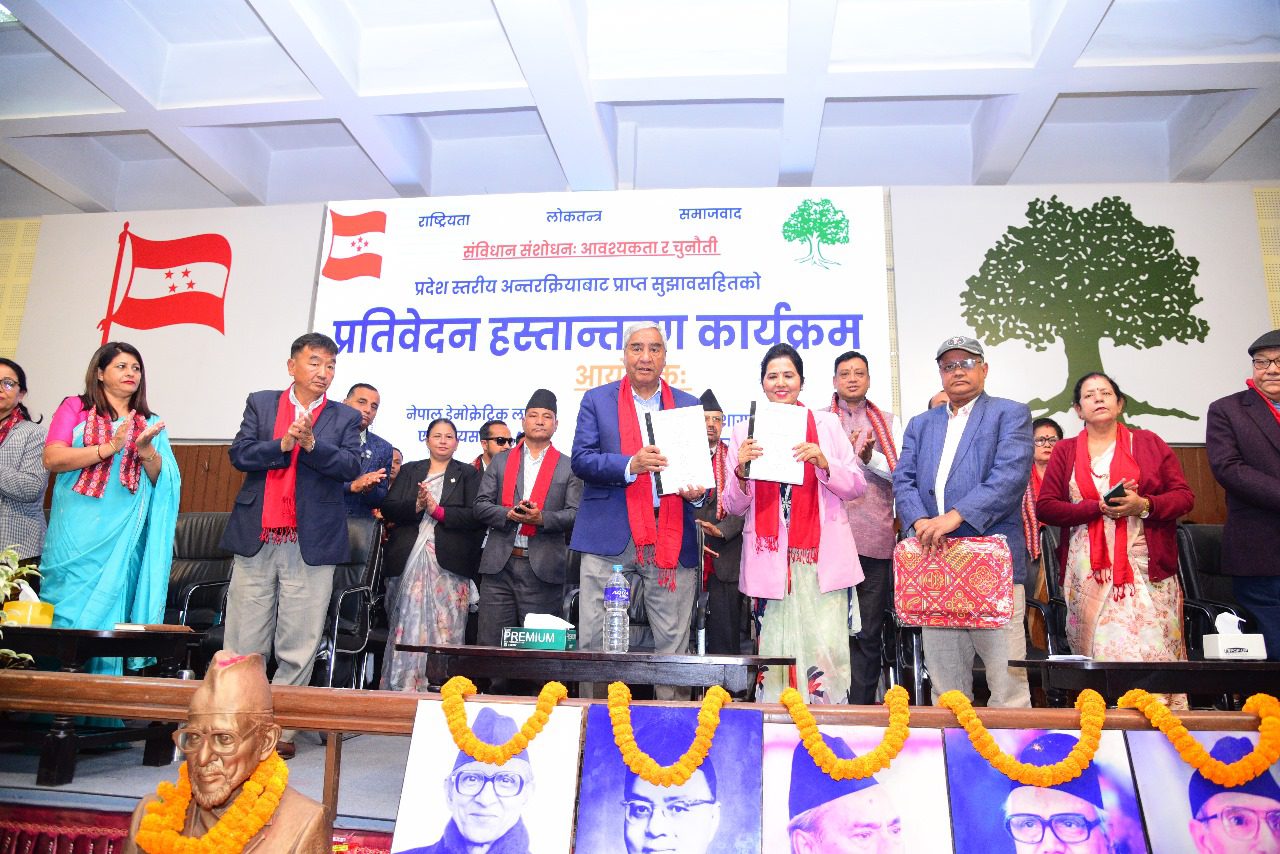 अध्ययन प्रतिवेदन बुझ्दै सभापति शेरबहादुर देउवाले अहिलेको संविधान अनुसार कुनै पनि दलले बहुमत ल्याउन कठिन हुने बताए । त्यसैले समय सापेक्षरुपमा संविधान संशोधनको आवश्यकता रहेको उनले प्रष्ट पारे ।‘हामीले सातै प्रदेशबाट प्राप्त सुझाव संकलन गरी पार्टी सभापतिलाई बुझाएका छौं। यसबाट संविधान संशोधनबारे धारणा बनाउन पार्टीलाई मदत पुग्ने हाम्रो विश्वास छ,’ डा संग्रौलाले भनिन्।सातै प्रदेशमा कार्यक्रम गरेर आफ्नो प्रतिवेदन पार्टीलाई बुझाउने पेशागत तथा बुद्धिजीवी विभाग पार्टीको पहिलो विभाग बनेको छ ।