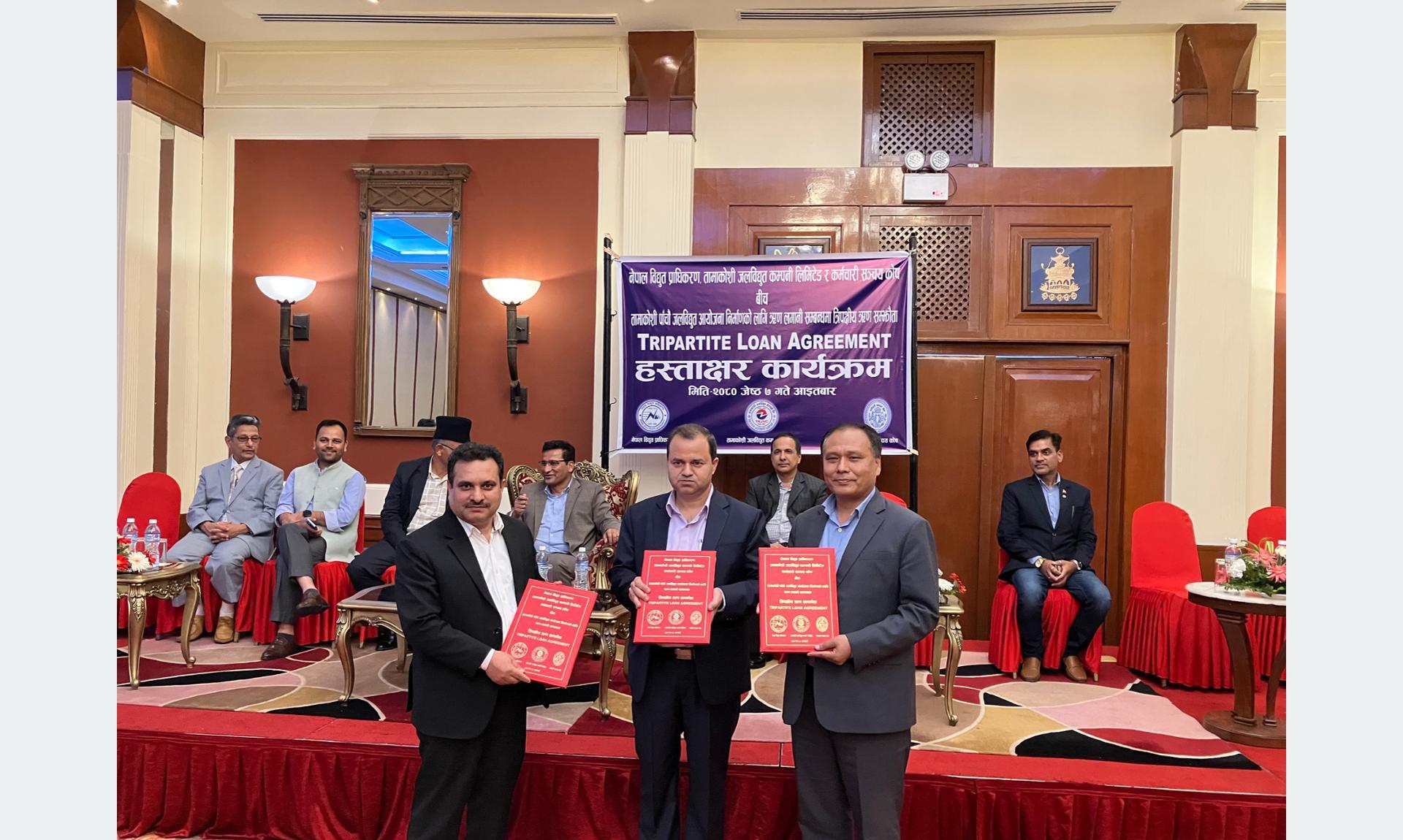 ऊर्जा, जलस्रोत तथा सिँचाइमन्त्री शक्तिबहादुर बस्नेतको उपस्थितिमा आइतबार नेपाल विद्युत् प्राधिकरण, आयोजनाको प्रवद्र्धक तामाकोसी जलविद्युत् कम्पनी र कर्मचारी सञ्चय कोषबीच त्रिपक्षीय ऋण सम्झौतामा हस्ताक्षर भएको हो । प्राधिकरणका कार्यकारी निर्देशक कुलमान घिसिङ, कोषका प्रशासक जितेन्द्र धिताल र कम्पनीका प्रमुख कार्यकारी अधिकृत (सीइओ) विनोद भण्डारीले सम्झौतामा हस्ताक्षर गरेका हुन् ।