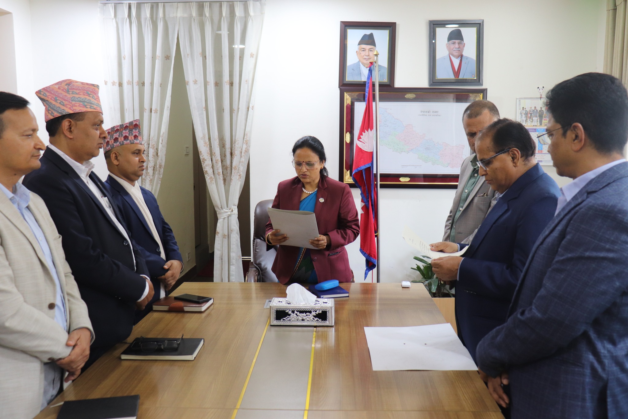 सिंहदरवारस्थित सञ्चार मन्त्रालयमा आज आयोजिन एक कार्यक्रममा नवनियुक्त बजार व्यवस्थापन सदस्य अधिकारीलाई सपथ गराएकि हुन् ।