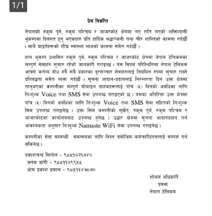 काठमाडौं:सरकारले भूकम्प प्रभावित तीन जिल्लामा नेपाल टेलिफोनको सेवा पाँच दिनका लागि निःशुल्क गरेको छ । सञ्चार तथा सूचना प्रविधिमन्त्री रेखा शर्माको निर्देशनमा नेपाल टेलिकमले पाँच दिनका लागि जाजरकोट, रुकुमपश्चिम र रुकुमपूर्वमा निःशुल्क भ्वाइस, एसएमएस र उद्धार क्षेत्रमा सूचना आदान प्रदान गर्न आवश्कयताअनुसार निःशुल्क नमस्ते वाइफाइ सेवा प्रदान गर्ने निर्णय गरेको हो ।