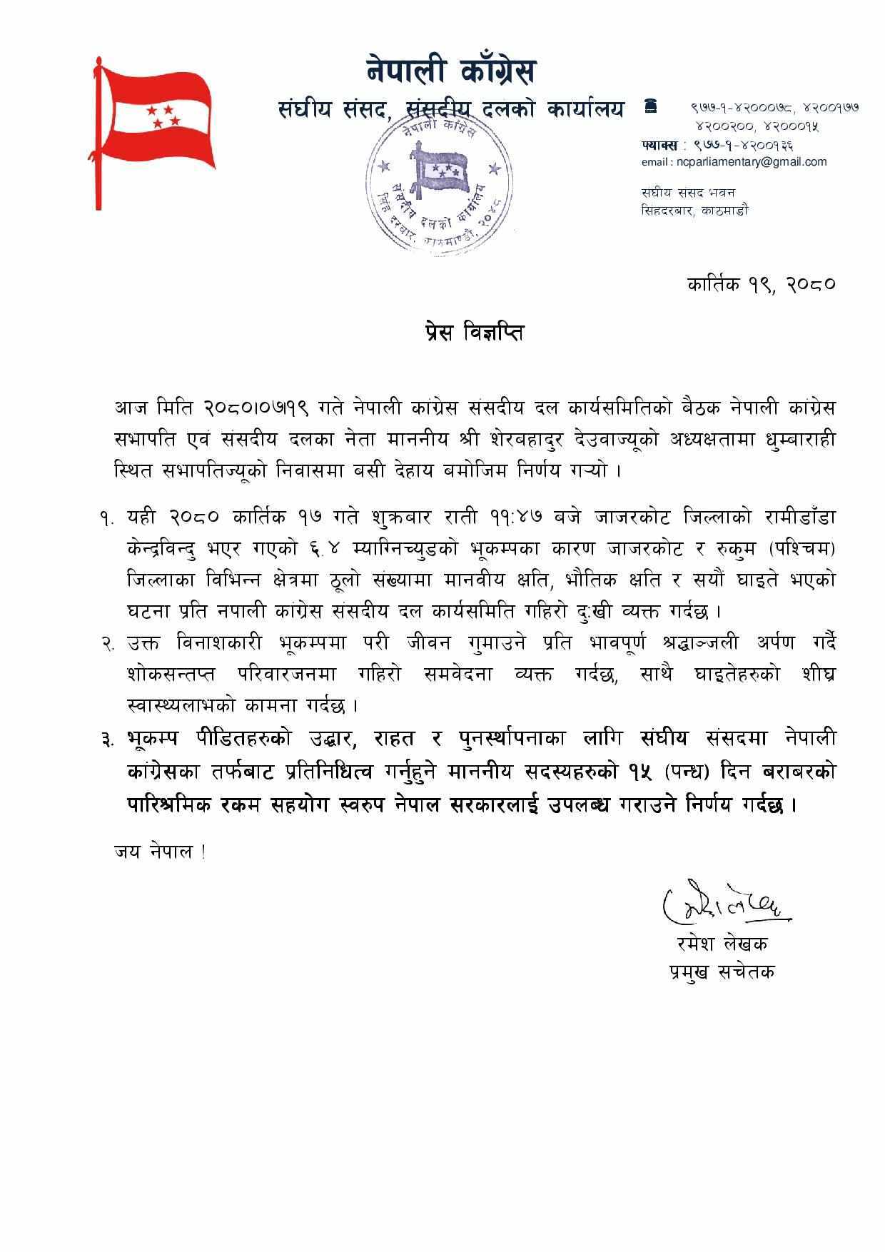 काठमाडौंः कांग्रेसका सांसद्हरुको १५ दिनको तलब भुकम्प पिडितलाई दिने भएको छ । सभापति शेरबहादुर देउवानिवास धुम्बाराहीमा बसेको कांग्रेस संसदीय दलको बैठकलेृ यस्तो निर्णय गरेको हो ।