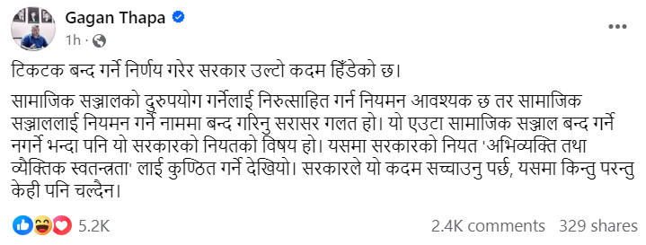 उनले सामाजिक संजालमा लेखेका छन् ‘ टिकटक बन्द गर्ने निर्णय गरेर सरकार उल्टो कदम हिँडेको छ। सामाजिक सञ्जालको दुरुपयोग गर्नेलाई निरुत्साहित गर्न नियमन आवश्यक छ तर सामाजिक सञ्जाललाई नियमन गर्ने नाममा बन्द गरिनु सरासर गलत हो। यो एउटा सामाजिक सञ्जाल बन्द गर्ने नगर्ने भन्दा पनि यो सरकारको नियतको विषय हो। यसमा सरकारको नियत ‘अभिव्यक्ति तथा व्यैक्तिक स्वतन्त्रता’ लाइ कुण्ठित गर्ने देखियो। सरकारले यो कदम सच्चाउनु पर्छ, यसमा किन्तु परन्तु केही पनि चल्दैन। ‘