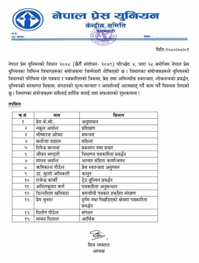 त्यसैगरी, उपाध्यक्ष ऋषिकान्त पौडेललाई प्रेस स्वतन्त्रता अनुगमन, डा.मुरारी अधिकारीलाई कानुन, राजेन्द्र कार्कीलाई ट्रेड युनियन प्रवद्र्धन, अनिल कुमार कर्णलाई पत्रकारिता अनुसन्धान, डिल्लीराम खतिवडालाई श्रमजीवी पत्रकार हकहित संरक्षण, प्रेम चुनारालाई दुर्गम तथा पिछडिएको क्षेत्रमा पत्रकारिता प्रवद्र्धन विभाग संयोजकको जिम्मेवारी तोकिएको छ । त्यसैगरी, युनियनका महासचिव दिलीप पौडेल संगठन विभाग प्रमुख र कोषाध्यक्ष माधव धिताल आर्थिक विभाग संयोजकको जिम्मेवारी पाएका छन् ।