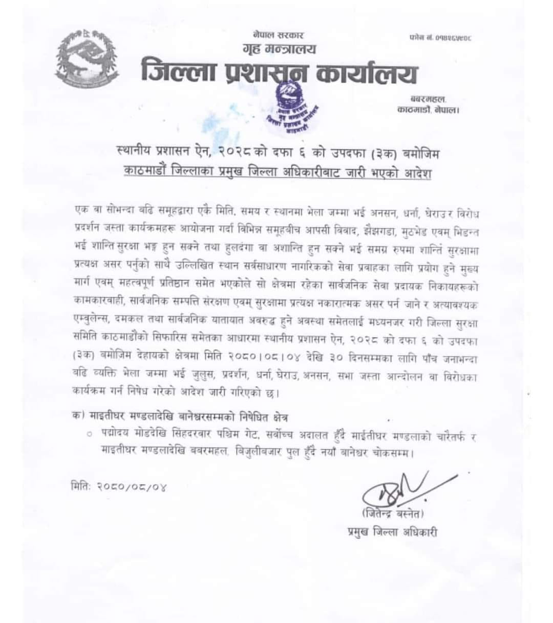 जिल्ला सुरक्षा समिति, काठमाडौंले गरेको सिफारिसका आधारमा सोमबारदेखि लागू हुने गरी पद्यमोदय मोडदेखि सिंहदरबार पश्चिम गेट, सर्वोच्च अदालत हुँदै माइतीघर मण्डलाको चौरतर्फ त्यस्तै माइतीघर मण्डलादेखि बबरमहल, बिजुलीबजार पुल हुँदै नयाँ बानेश्वर चोक ३० दिनसम्म जिल्ला प्रशासन कार्यालय काठमान्डौले निषेधित क्षेत्र तोक्ने निर्णय गरेको छ ।