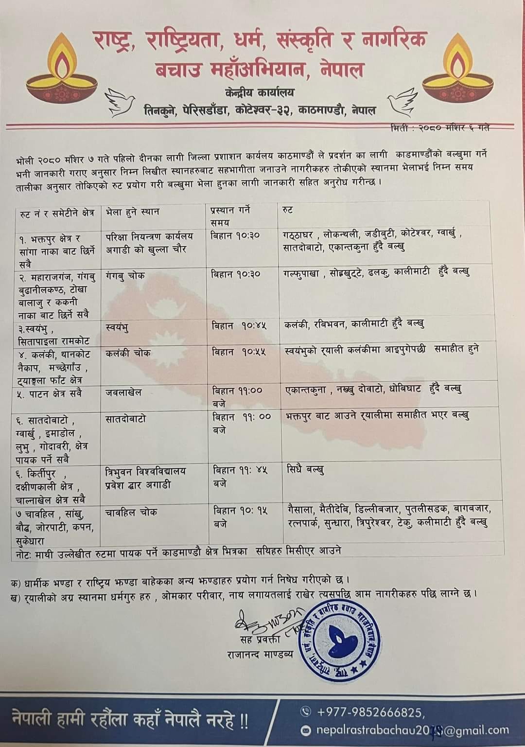 त्यस्तै नेकपा एमालेको युवा तथा विद्यार्थी संगठनले ७ मंसिरमा आयोजना गरेको प्रदर्शन कार्यक्रम काठमाडौंको तिनकुनेमा हुने भएको छ । एमालेको युवा संगठन राष्ट्रिय युवा संघका अध्यक्ष क्षितिज थेबेले सोमबार एक सूचना जारी गरी सरकारले माइतीघरदेखि बानेश्वरसम्म निषेधाज्ञा तोकेकाले तिनकुनेमा प्रदर्शन गर्ने जानकारी गराएका छन् । यससँगै सरकारले सुरक्षा व्यवस्थामा कडाई गरेकाे छ ।
