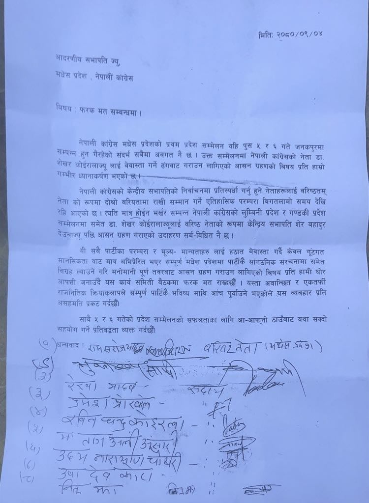 कोइरालानिकट प्रदेश कार्यसमिति सदस्य रविन कोइराला भने वरिष्ठ नेता र दोस्रो वरीयता स्विकारिसकेको अवस्थामा मधेशमा पनि स्विकार्नुपर्ने बताउँछन् । सभापतिपछिको दोस्रो वरीयता नदिएकालेकोइराला निकटले प्रदेश कार्यसमिति बैठकमा ‘नोट अफ डिसेन्ट’ राखेका हुन्।