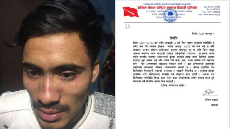 काठमाडाैं । नेकपा एमालेको भातृ संगठन अनेरास्ववियुका नेता तथा अस्कल क्याम्पस मदन भण्डारी स्पोर्ट्स एकेडेमीका उपाध्यक्ष प्रकाश वयकमाथि हातपात भएको छ ।बुधबार राती ७ बजे तिर नेपाल प्रहरीको प्रतिनिधि हुं भनेर कल गर्दै अस्कल होस्टल बाहिर आउनु ऋक्क्ष्त् को फर्म भर्नु छ भनि बोलाएर अस्कल होस्टेल बाहिरबाट उठाएर सोधपुछ गर्नु छ भनि विनाकसुर हतकडि लगाएर दरबारमार्ग वृतको प्रहरीले टोखामा लगेर विभिन्न आरोप लगाउँदै कुटपिट भएको अनेरास्ववियुले जनाएको छ ।